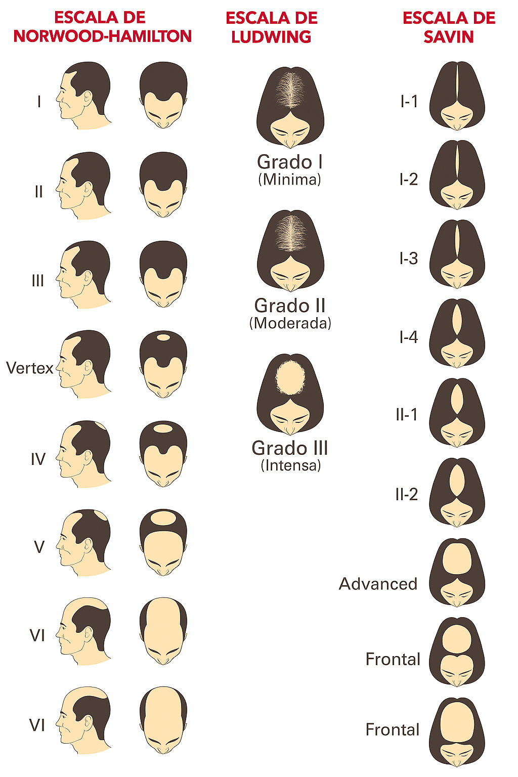Puedes orientarte con la siguiente imagen para identificar tu grado de alopecia.